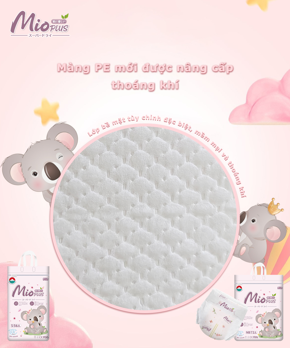 - Bề mặt được thiết kế hàng ngàn lỗ nhỏ theo công nghệ hoàn toàn mới giúp bề mặt luôn lưu thông và khô thoáng, cùng với thiết kế 3D nâng cao giúp giảm tiếp xúc với da bé tránh tình trạng ẩm mông và dị ứng